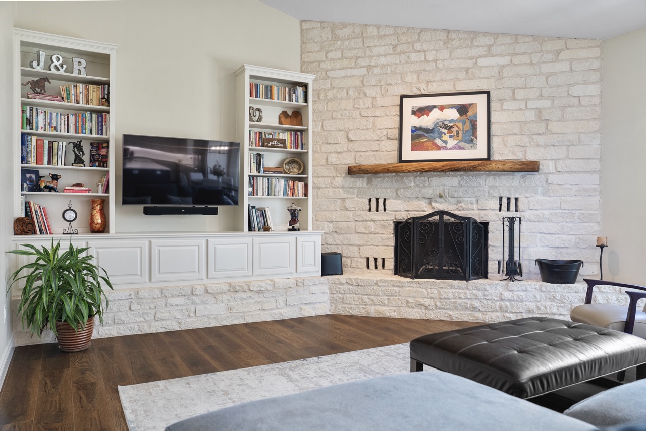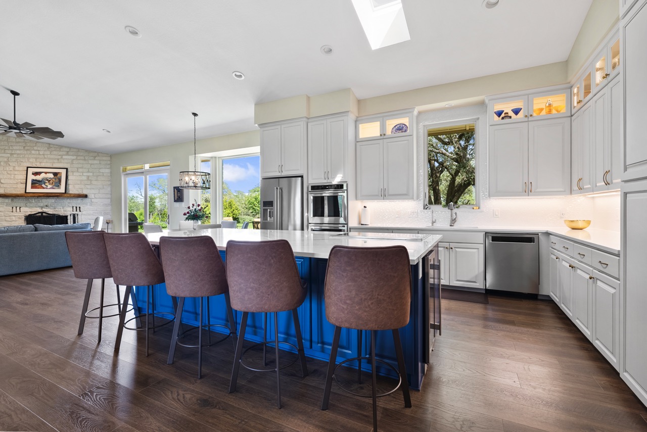 The main house on the property is 3,309 sq ft, 3-bedroom, 2.5-bath. In 2021, the one-story ranch style home was meticulously renovated to reflect upscale country living, with an open-concept design and large picture windows that flood the space with natural light and highlight panoramic Hill Country scenery from every room. An oversized Cambria quartz island anchors the kitchen, surrounded by custom cabinetry, a wine fridge, induction cooktop, and high-end KitchenAid appliances. In the living room, a stone wood-burning fireplace with a custom black walnut mantle brings warmth and character, while the dining area opens to the back patio with 8-foot sliding glass doors. The primary bedroom suite feels like a retreat of its own, featuring private patio access and a soaking tub that looks out over the land, perfect for unwinding after a long day. Among the homes thoughtful additions is a dedicated bonus room, currently set up as a home gym. This large room has access to the half bath and the kitchen making it perfect for a gym, game room or extra family room. The impressive cedar front porch with vaulted ceiling offers incredible sunsets and Hill Country views. The home is complemented by an oversized 3-car garage, offering attic space and a large storage room. The beautifully landscaped front and back yards include an automatic irrigation system that is fed by the 30,000-gallon rainwater collection system, which includes a fire hydrant connection. Nearby, a 16 x 40 arched cabin with AC, heating and water presents the perfect flex space, ideal for a guest suite, studio, office, or guest bunkhouse.