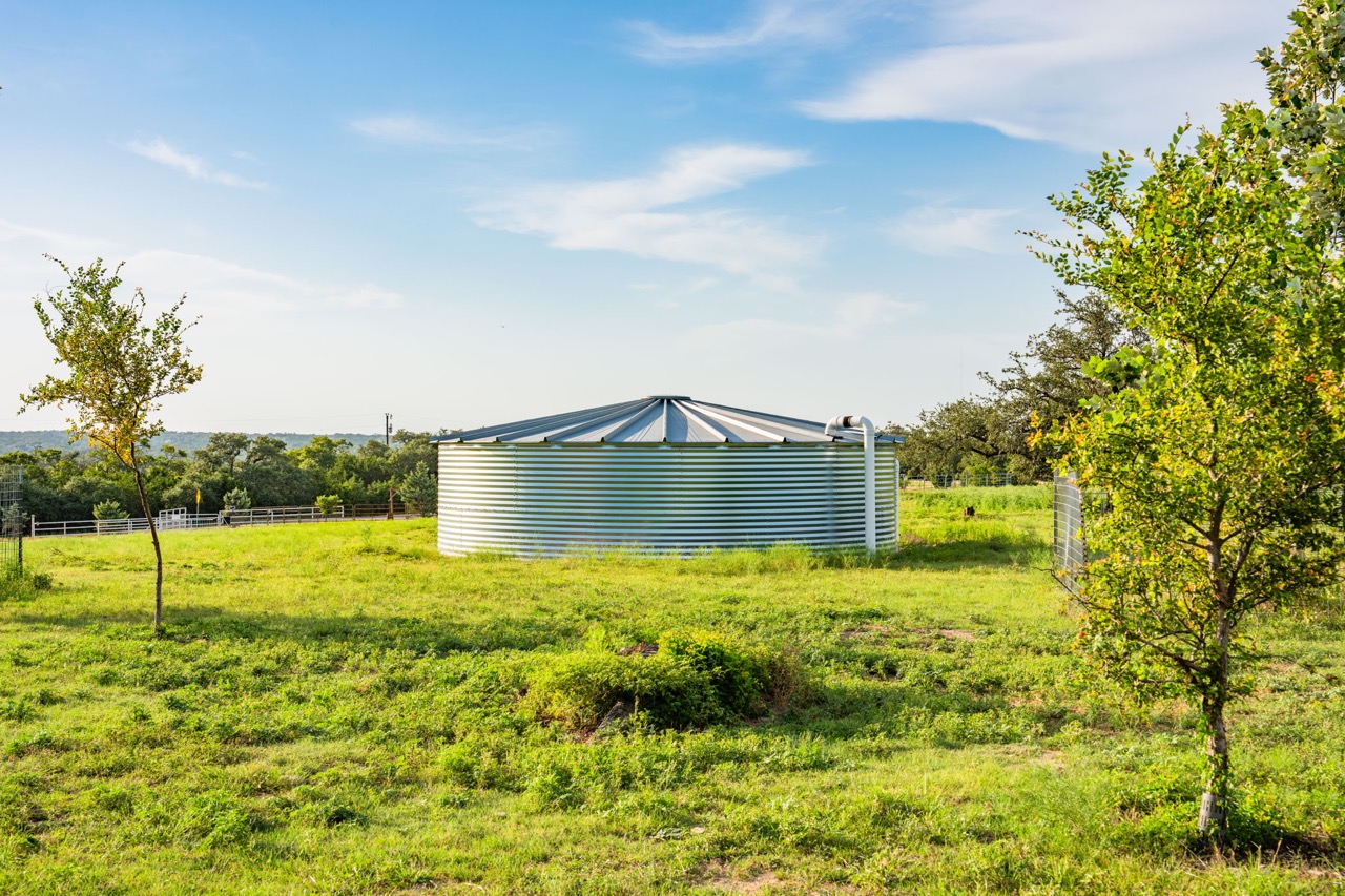 With a water well and two ponds (with potential to expand or add additional ponds), water is well-accounted for across the ranch. A 30,000-gallon rainwater collection system feeds the automatic irrigation for both the front and back yards and includes a fire hydrant hookup. The system could also be connected to the main home, offering a sustainable backup option.
